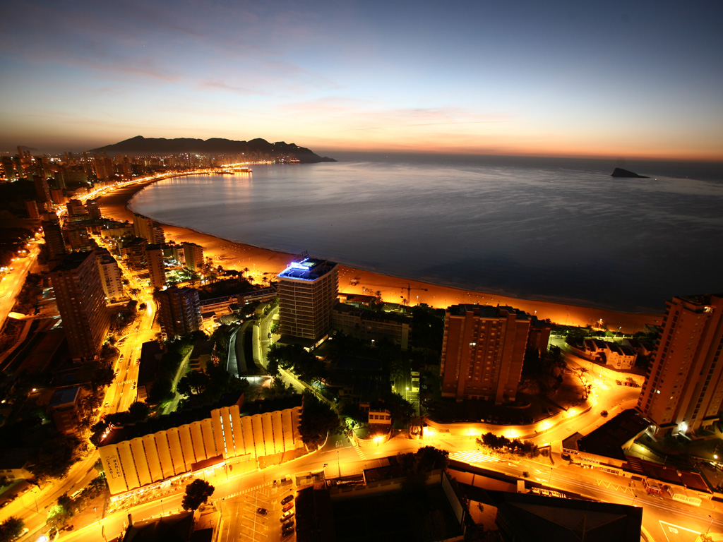 Scaldat in apele Marii Mediterane, Benidorm este o statiune turistica asezata in golful Marina Baixa a carei grandoare este eclipsata doar de dimensiunile gargantuelice ale muntelui Puig Campana, a carei statura fizica protejeaza orasul de raceala vanturilor nordice, rasfatandu-l in acelasi timp cu un climat bland. Inaltimea varfurilor impozante care umbresc coasta nu sunt egalate decat de linia unica ce se proiecteaza pe cer din aglomerarea de hoteluri sau cladiri care mai ca strapung norii, dupa ce, au iesit parca din mare si au rasarit pe plajele cu nisip auriu peste noapte.
